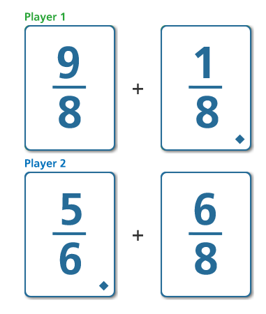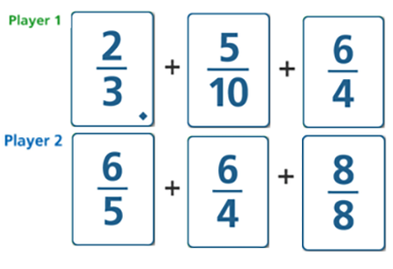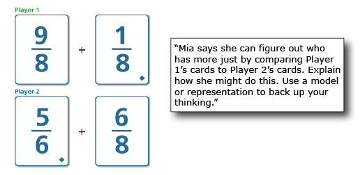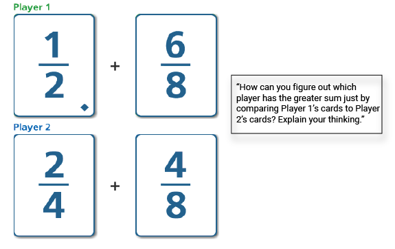 It is important to also offer students who may typically need more support opportunities to think about a task in ways that will extend their thinking about the mathematics. For example, students who are playing with an adapted deck of cards, consisting only of related fractions less than 1, can be challenged to reason about the greater sum with a problem such as the following: