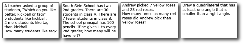 Select one of the problems shown above. What role does language play in understanding the problem? Jot down some notes about possible challenges students might encounter accessing the problem and expressing their solutions. You will return to these notes in Activity 2.